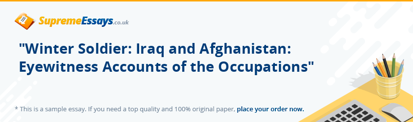 To sum up, Winter Soldier: Iraq and Afghanistan: Eyewitness Accounts of the Occupations is a shocking book with the sensational revelations about the occupation of Americans in the wars in Afghanistan and Iraq. It changes the meaning of the American mission in Asia and displaces its anti-terroristic meaning through the striking discoveries. The author has gathered information on the meeting of veterans who organized the program of Winter Soldier and had some courage to object to the governmental stereotypes. The work shows the painful truth and all the atrocities of war and recognizes the American occupation in Asia as the biggest act of terrorism.